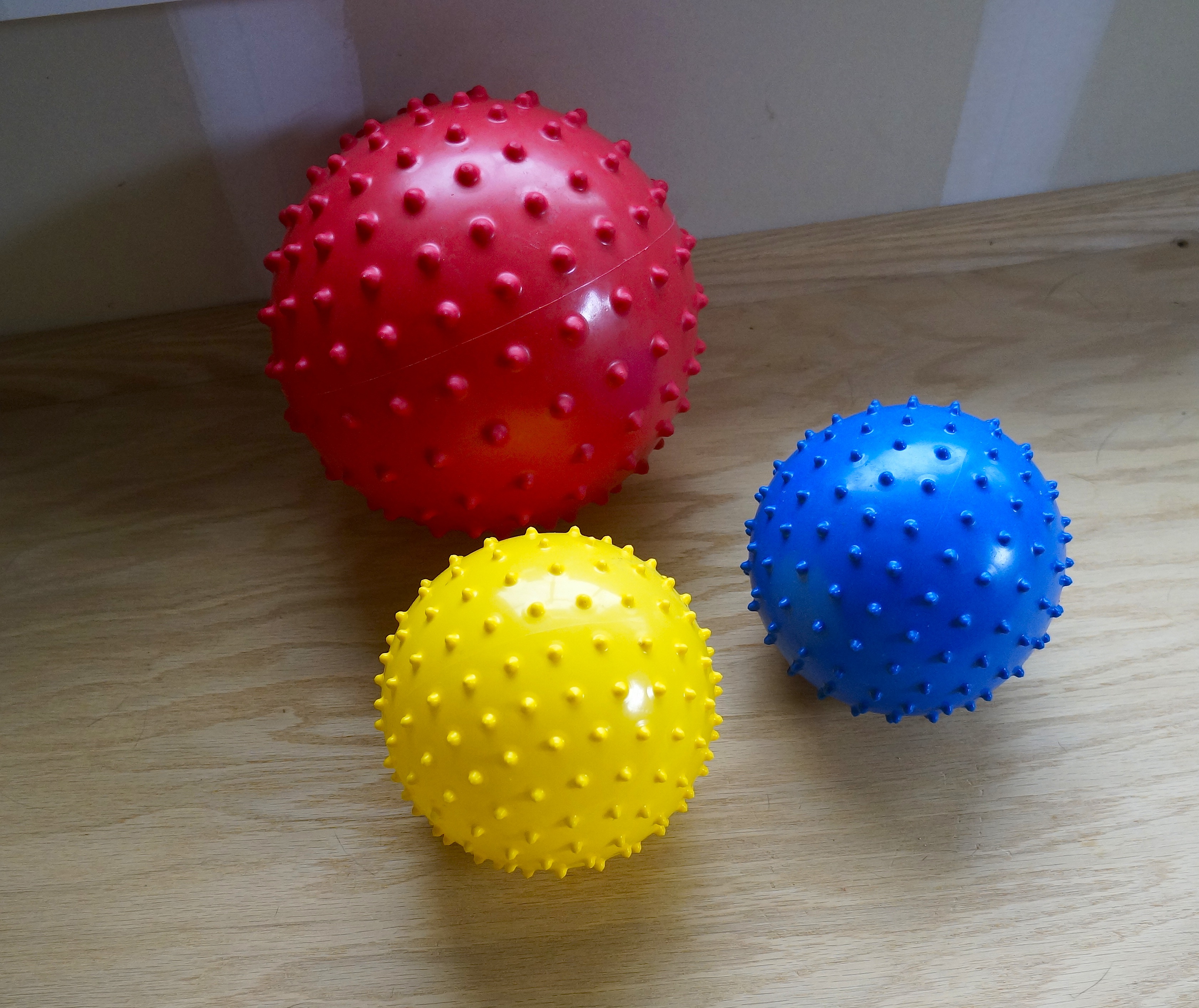 I purchased these balls at different places, different times. I found the large red one at the grocery store and the yellow and blue at different drug stores. They're light and the bumps make them perfect for little hands. Once only an educational specialty toy, they are so wonderful that now they're everywhere, even in the drug store toy section...