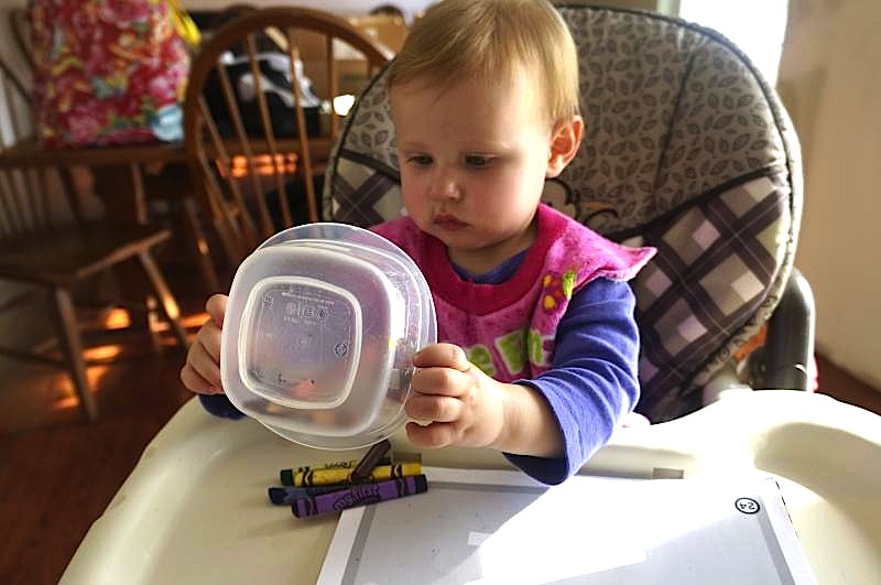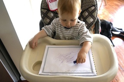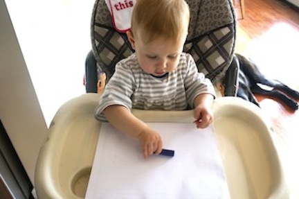 Picking up each crayon and putting it back is learning. You can say "one, two, three..." to set up the audio pattern for counting in the future. Begin with three crayons. The high chair is a perfect setting for scribbling... good seating and a contained work surface. A safe place to practice her skills while dinner is cooking.