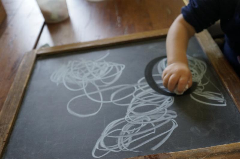 We are using sidewalk chalk which is just the right thickness. Also, she can erase with a small piece of sponge and get more motor practice. This black board was mine as a child, it's heavy slate and stays put. It used to be part of an easel that is long gone, another example of the art of saving stuff you might need in the future!