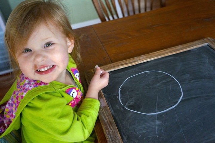 At first, just seeing that a line tracks her hand movement is fascinating. Holding a crayon or piece of chalk while pushing down to draw a line is a skill worth practicing.