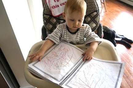 A few months later... there are intentional lines to be made. Up and down, circle and side to side are lines you can encourage by saying "let's go round and round..."