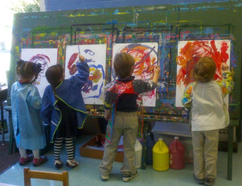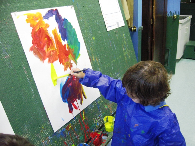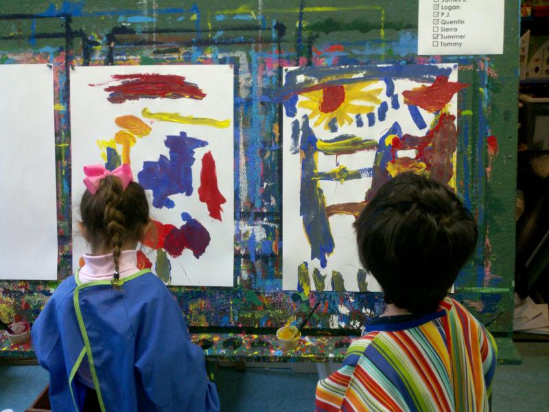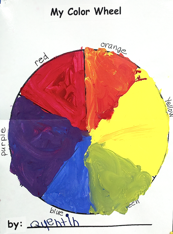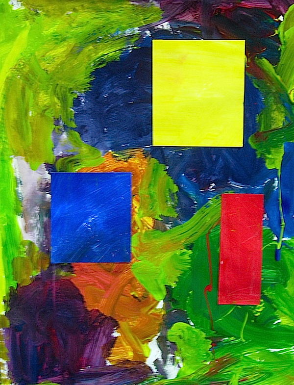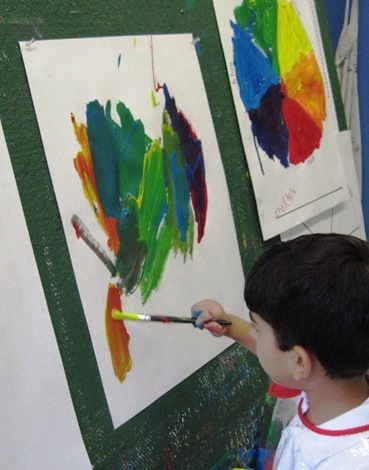 When the color wheel is complete children can practice what they have just learned by making a color field painting in the tradition of Hans Hofmann. They are amazed by the variety of colors they can create using only red, yellow and blue. The rectangles represent the primary colors. They are placed on or near complimentary color. Hans Hofmann was influential as an artist and as a teacher. Children are amazed that he painted like this when he was grownup!