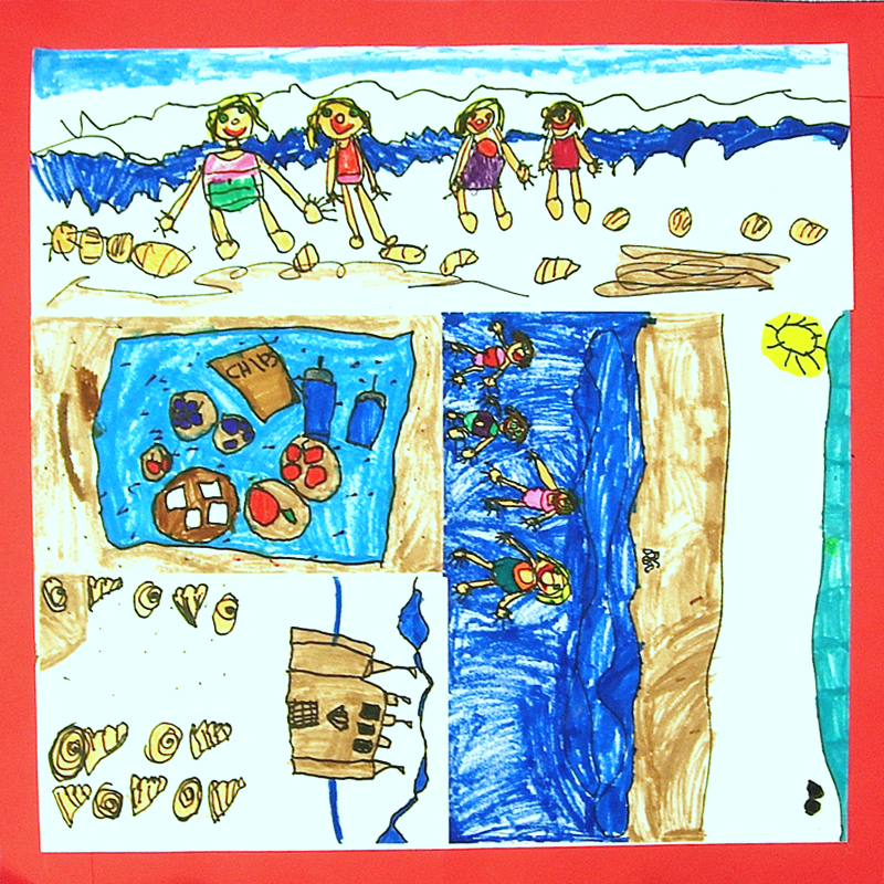A day at the beach making sand castles and collecting shells.