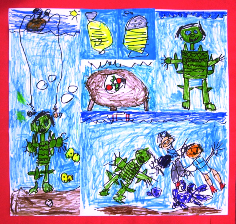 Each dreamscape is planned using many skills that students use when they become writers. They choose a subject, construct a detailed idea, mapped out the scenes, decided on which elements should be more important than others.